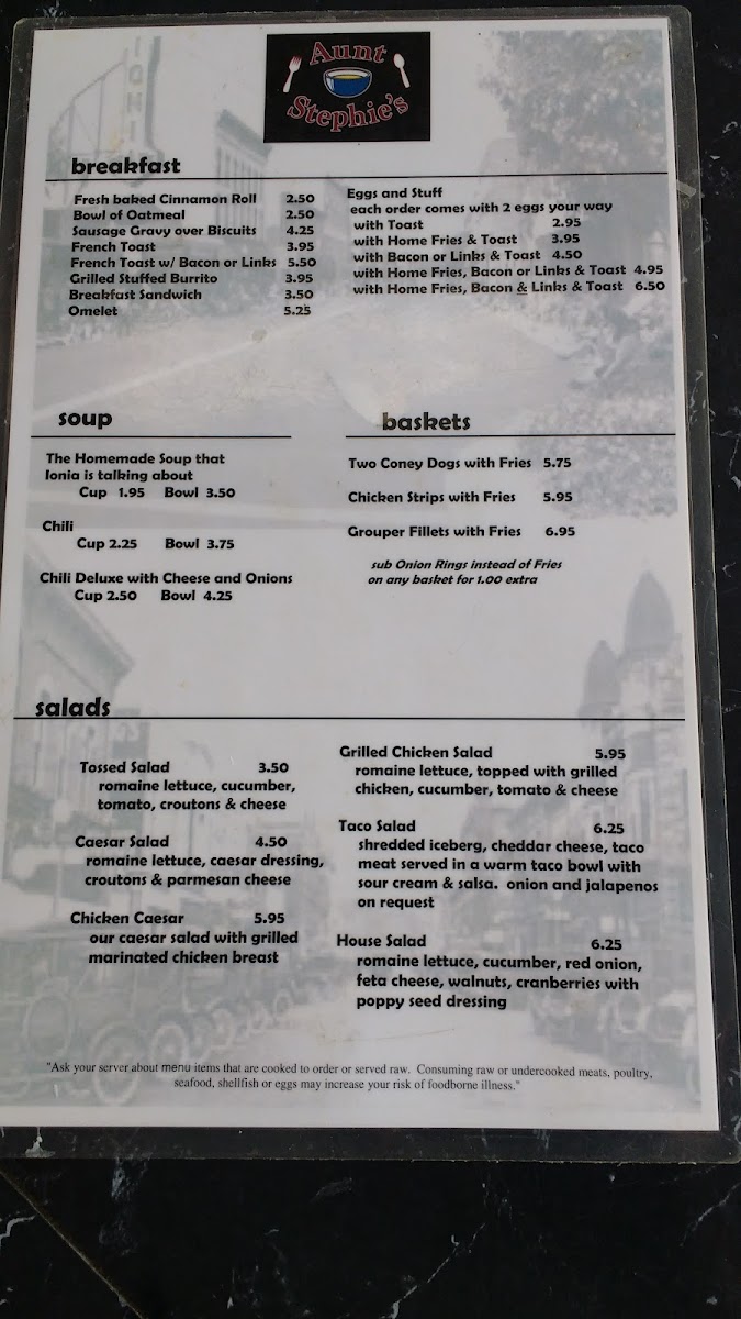 Welcome to Aunt Stephie's, a charming diner nestled on Main Street in Ionia, MI. This family-run establishment embraces a cozy, homey atmosphere that transports you back to simpler times. Aunt Stephie delights patrons with a menu that celebrates hearty, homemade goodness.